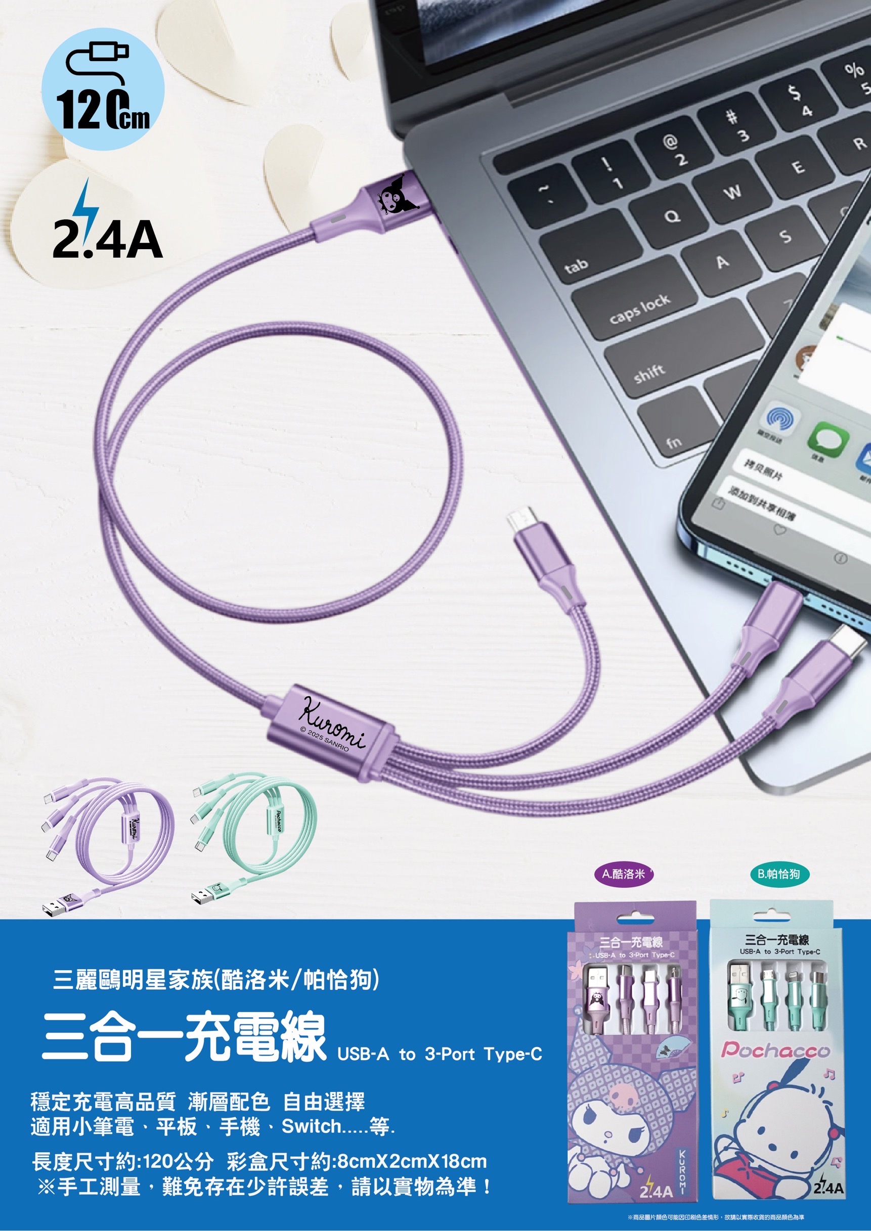 ※加入購物車後,須完成訂單, 系統才會轉成最終的批發價格 選購上若有疑問, 可取消訂單或是私訊新創小幫手唷! ❤ 三麗鷗-三合一充電線 系列❤ ▪批量級距價格▪ ♥下單 1 個以上 $ 96 /元 ♥下單 6 個以上 $ 66 /元 ♥下單 12 個以上 $ 60 /元 規格120cm/2.4A/USB-A to 3port 包裝尺寸2x2x8cm 隨機出貨或是平均出貨 一箱120入