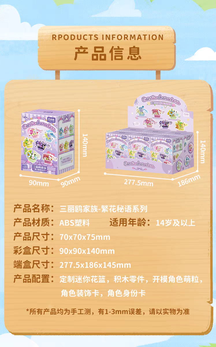 ※加入購物車後,須完成訂單, 系統才會轉成最終的批發價格 選購上若有疑問, 可取消訂單或是私訊新創小幫手唷! ❤ 三麗鷗家族/繁花祕語系列/擺飾盲盒(6入) 系列❤ ▪批量級距價格▪ ※盲盒均屬整盒販售※ ♥下單數量"1"端盒 6 入 $ 840 盒/元 ♥下單數量"1"端盒 6 入 $ 840 盒/元 ♥下單數量"1"端盒 6 入 $ 840 盒/元 803304 尺寸9x9x14cm 端盒尺寸18.6x22.7x14.5cm 一端盒6入,整盒販售 一箱48入