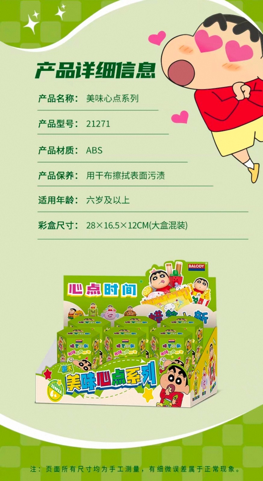 ※加入購物車後,須完成訂單, 系統才會轉成最終的批發價格 選購上若有疑問, 可取消訂單或是私訊新創小幫手唷! ❤ 蠟筆小新/美味心點積木/盲盒(6入) 系列❤ ▪批量級距價格▪ ※盲盒均屬整盒販售※ ♥下單數量"1"端盒 6 入 $ 540 盒/元 ♥下單數量"1"端盒 6 入 $ 540 盒/元 ♥下單數量"1"端盒 6 入 $ 540 盒/元 21271 尺寸8.2x9.3x11.5cm 端盒尺寸16.5x28x12cm 一端盒6入,整盒販售 一箱108入