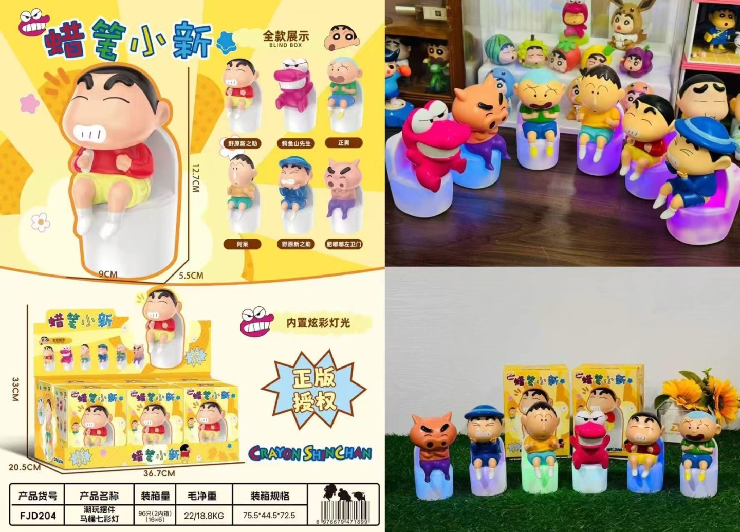 ※加入購物車後,須完成訂單, 系統才會轉成最終的批發價格 選購上若有疑問, 可取消訂單或是私訊新創小幫手唷! ❤ 蠟筆小新-馬桶七彩彩虹燈/盲盒(6入) 系列❤ ※盲盒均屬整盒販售※ ♥下單數量"1"端盒 6 入 $ 660 盒/元 ♥下單數量"1"端盒 6 入 $ 660 盒/元 ♥下單數量"1"端盒 6 入 $ 660 盒/元 FJD204 尺寸10.2x12x13cm 端盒尺寸20.5x36.7x13.5cm 一端盒6入,整盒販售 一箱96入