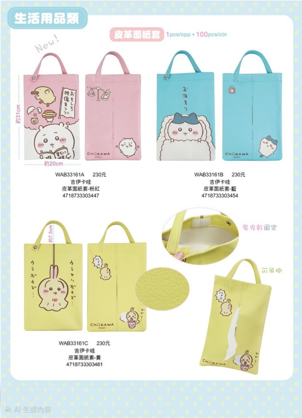 ※加入購物車後,須完成訂單,系統才會轉成最終的批發價格 選購上若有疑問,可取消訂單或是私訊新創小幫手唷! ❤ 吉伊卡哇-皮革面紙套(三款) 系列❤ ▪批量級距價格▪ ♥下單 1 個以上 $ 184 /元 ♥下單 3 個以上 $ 127 /元 ♥下單 6 個以上 $ 115 /元 尺寸20x31cm 隨機出貨或是平均出貨 一箱100入