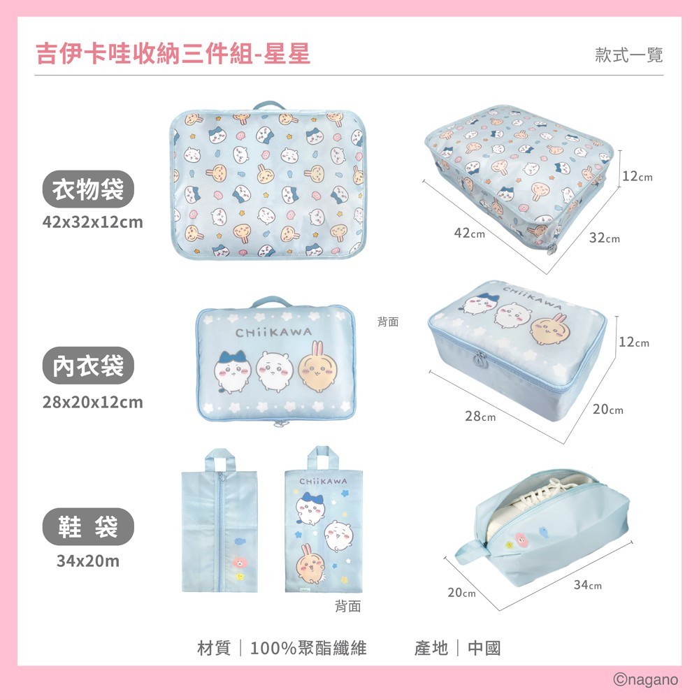 ※加入購物車後,須完成訂單, 系統才會轉成最終的批發價格 選購上若有疑問, 可取消訂單或是私訊新創小幫手唷! ❤ 吉伊卡哇-收納三件組 系列❤ ▪批量級距價格▪ ♥下單 1 個以上 $ 368 /元 ♥下單 2 個以上 $ 230 /元 衣物袋尺寸:32x42x12cm 內衣袋尺寸:20x28x12cm 鞋子袋尺寸:20x34cm 一箱50入