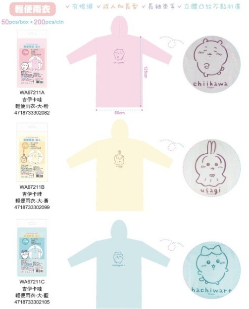 ※加入購物車後,須完成訂單,系統才會轉成最終的批發價格 選購上若有疑問,可取消訂單或是私訊新創小幫手唷! ❤ 吉伊卡哇-成人輕便雨衣(3款) 系列❤ ▪批量級距價格▪ ♥下單 1 個以上 $ 64 /個 ♥下單 6 個以上 $ 44 /個 ♥下單 12 個以上 $ 40 /個 尺寸:80 x 125 cm 重量:70g 材質:PE(聚乙烯) 一箱200入