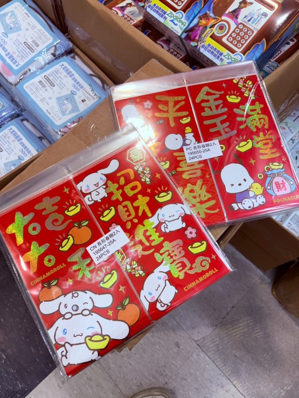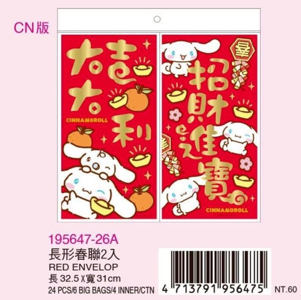 ※加入購物車後,須完成訂單, 系統才會轉成最終的批發價格 選購上若有疑問, 可取消訂單或是私訊新創小幫手唷! ❤ 三麗鷗-長形春聯(2入)/兩款 系列❤ ▪批量級距價格▪ ♥下單 1 個以上 $ 48 /元 ♥下單 6 個以上 $ 33 /元 ♥下單 12 個以上 $ 30 /元 尺寸:32.5x31cm 款式:大耳狗/帕洽狗/酷洛米 一份2入 一包6入 一箱144入