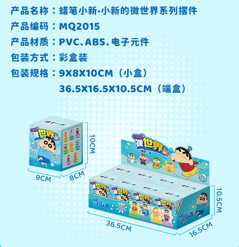※加入購物車後,須完成訂單, 系統才會轉成最終的批發價格 選購上若有疑問, 可取消訂單或是私訊新創小幫手唷! ❤ 蠟筆小新-小新的微世界/燈光公仔/盲盒(8入) 系列❤ ▪批量級距價格▪ ※盲盒均屬整盒販售※ ♥下單數量"1"端盒 8 入 $ 1440 盒/元 ♥下單數量"1"端盒 8 入 $ 1440 盒/元 ♥下單數量"1"端盒 8 入 $ 1440 盒/元 MQ2015 尺寸9x8x10cm 端盒尺寸16.5x36.5x10.5cm 一端盒8入,整盒販售 一箱80入