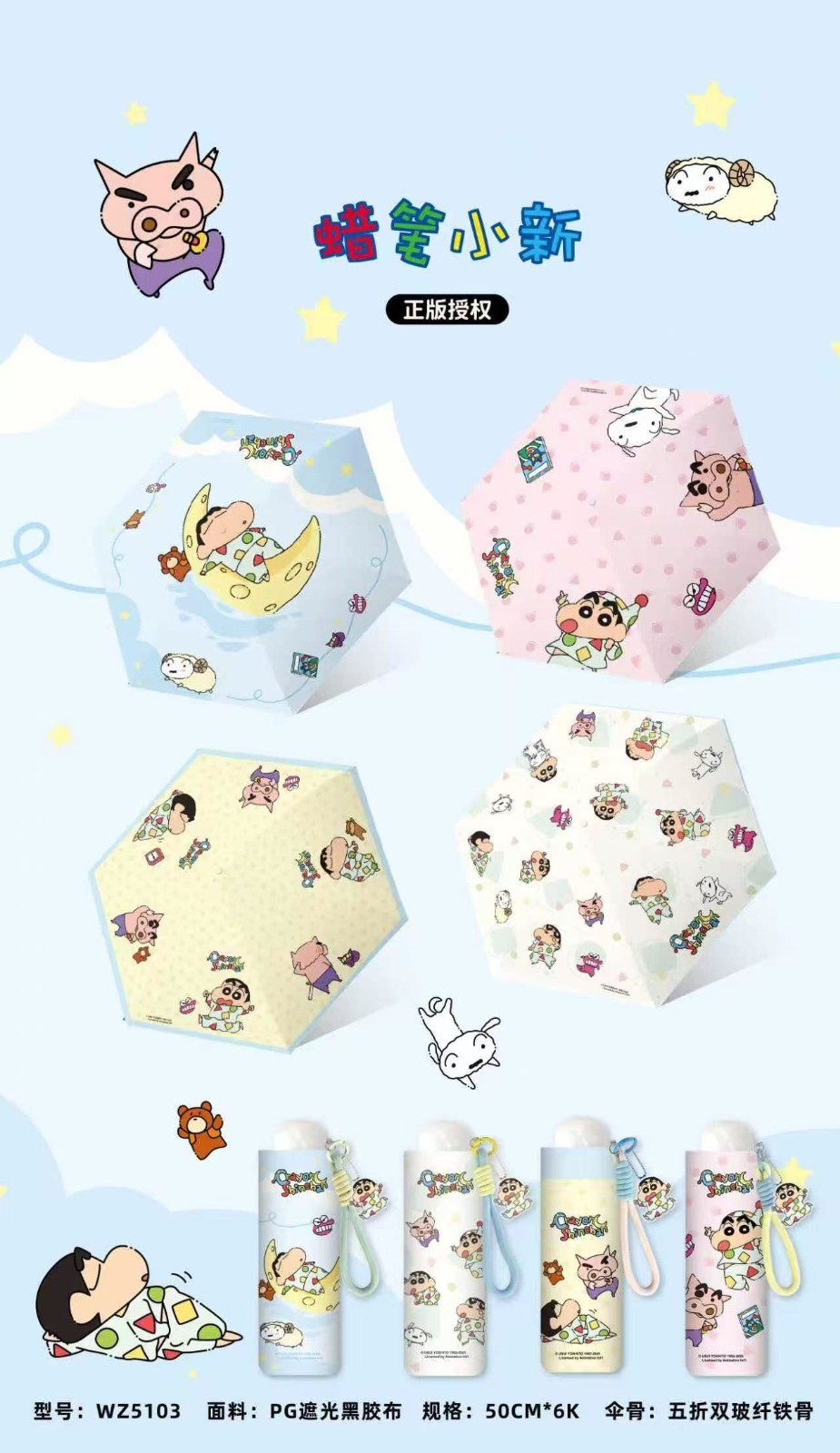 ※加入購物車後,須完成訂單, 系統才會轉成最終的批發價格 選購上若有疑問, 可取消訂單或是私訊新創小幫手唷! ❤ 蠟筆小新-五折手動/晴雨傘(四款) 系列❤ ▪批量級距價格▪ ♥下單 1 個以上 $ 256 /元 ♥下單 2 個以上 $ 176 /元 ♥下單 4 個以上 $ 160 /元 WZ5103 展開尺寸50cmx6K 收合尺寸18cm 隨機出貨或是平均出貨 一盒12入 一箱72入