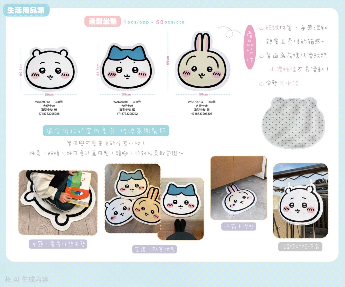 ※加入購物車後,須完成訂單,系統才會轉成最終的批發價格 選購上若有疑問,可取消訂單或是私訊新創小幫手唷! ❤ 吉伊卡哇-造型坐地墊(三款) 系列❤ ▪批量級距價格▪ ♥下單 1 個以上 $ 240 /元 ♥下單 2 個以上 $ 165 /元 ♥下單 3 個以上 $ 150 /元 尺寸59x66cm範圍 隨機出貨或是平均出貨 一箱50入