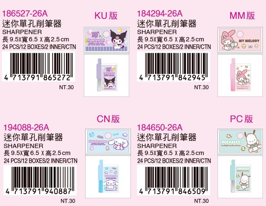 ※加入購物車後,須完成訂單, 系統才會轉成最終的批發價格 選購上若有疑問, 可取消訂單或是私訊新創小幫手唷! ❤ 三麗鷗-迷你單孔削筆器(四款) 系列❤ ▪批量級距價格▪ ♥下單 1 個以上 $ 24 /元 ♥下單 2 個以上 $ 17 /元 ♥下單 4 個以上 $ 15 /元 尺寸9.5x6.5x2.5cm 一盒24入,整盒販售 一箱288入