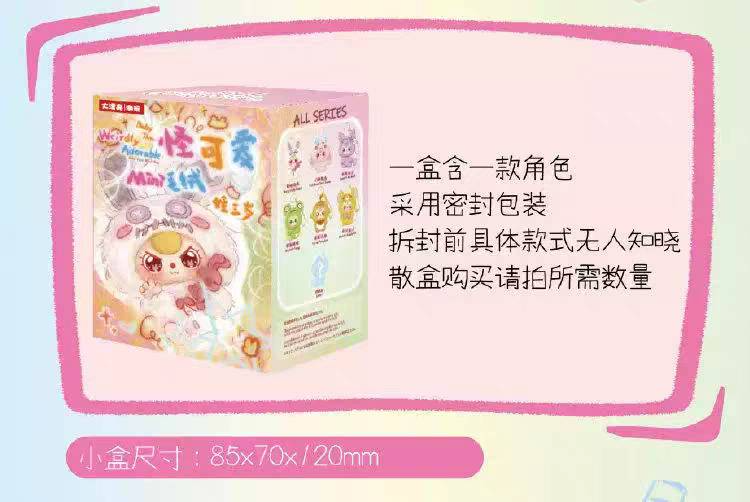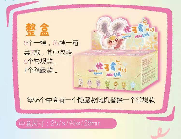 ※加入購物車後,須完成訂單, 系統才會轉成最終的批發價格 選購上若有疑問, 可取消訂單或是私訊新創小幫手唷! ❤ 娃三歲-怪可愛mini毛絨掛件盲盒(6入) 系列❤ ▪批量級距價格▪ ※盲盒均屬整盒販售※ ♥下單數量"1"端盒 6 入 $ 1140 盒/元 ♥下單數量"1"端盒 6 入 $ 1140 盒/元 ♥下單數量"1"端盒 6 入 $ 1140 盒/元 尺寸8.5x7x12cm 端盒尺寸14.5x26.1x12.5cm 一端盒6入,整盒販售 一箱96入
