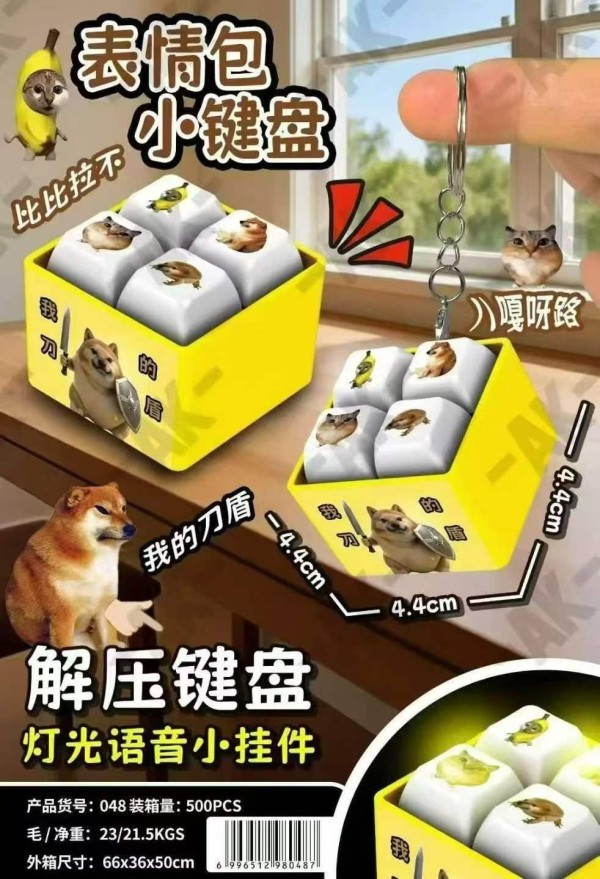 ※加入購物車後,須完成訂單, 系統才會轉成最終的批發價格 選購上若有疑問, 可取消訂單或是私訊新創小幫手唷! ❤ 爆紅迷音梗!!刀盾狗-解壓鍵盤燈光/語音掛件 系列❤ ▪批量級距價格▪ ♥下單 1 個以上 $ 40 /元 ♥下單 10 個以上 $ 28 /元 ♥下單 20 個以上 $ 25 /元 048 尺寸4.4x4.4x4.4cm 一包20入,整包販售 一箱500入